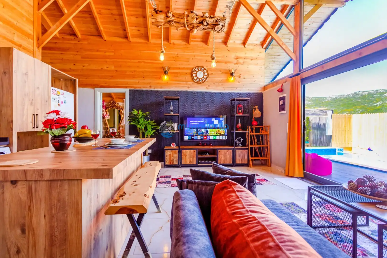 Salon : Salon içerisinde oturma grubu, TV, TV ünitesi, orta sehpa,klima ve havuz terasına geçiş bulunmaktadır.