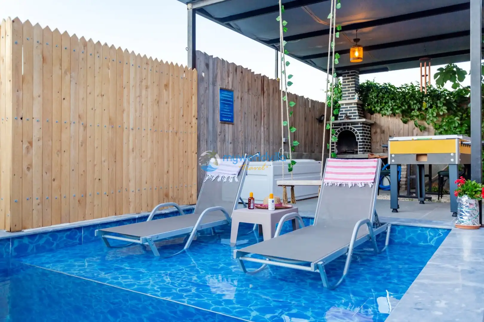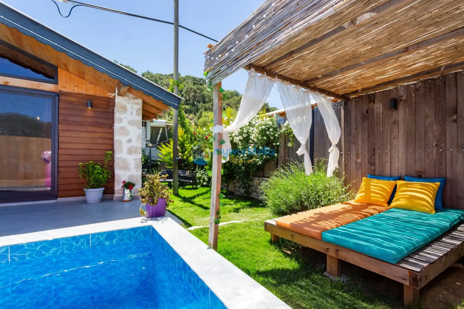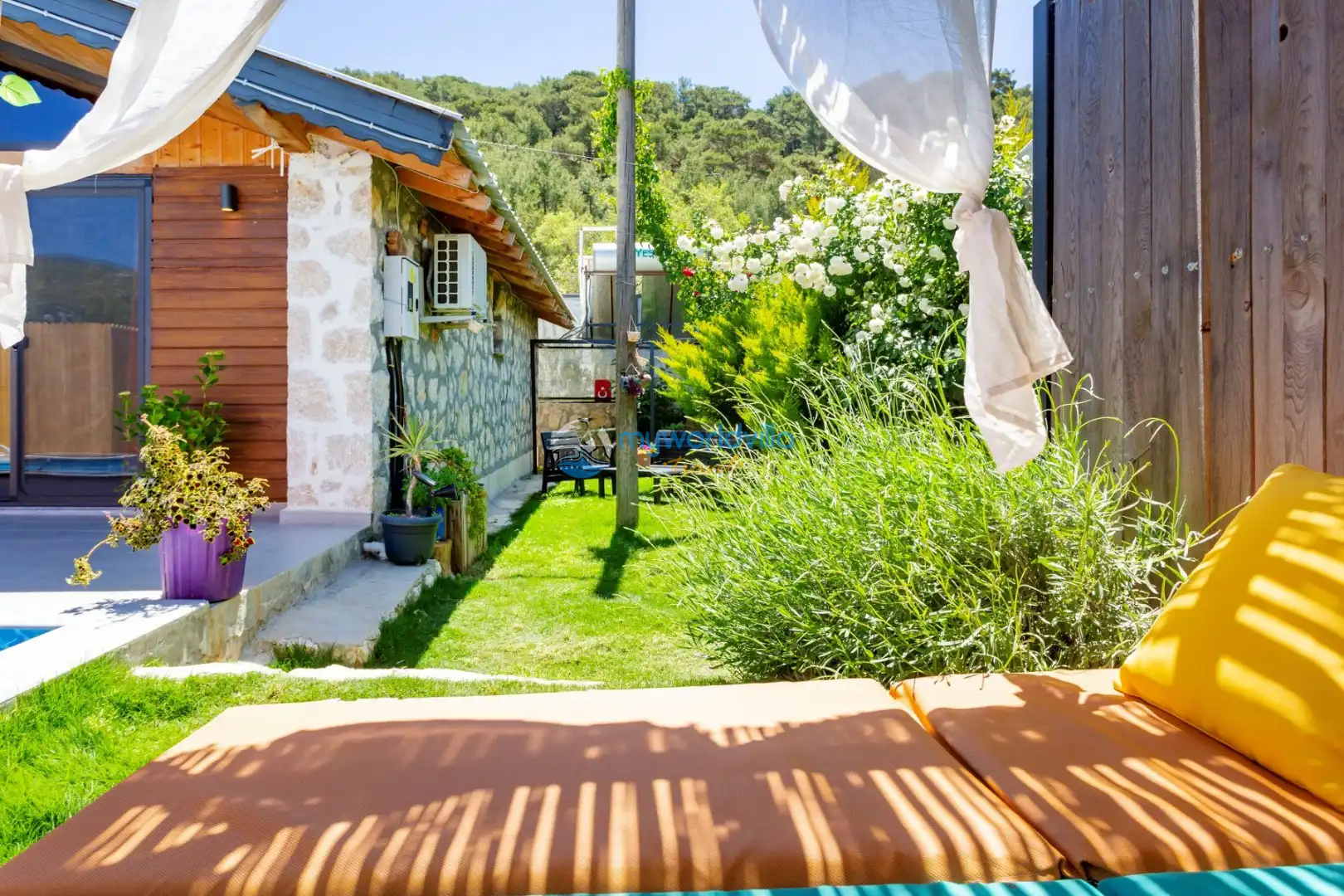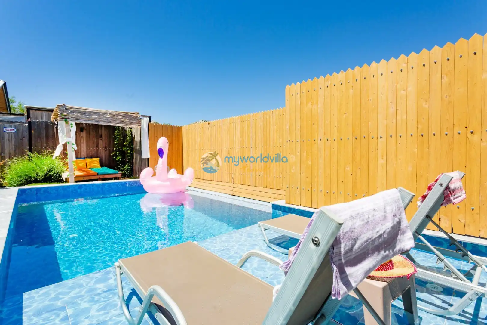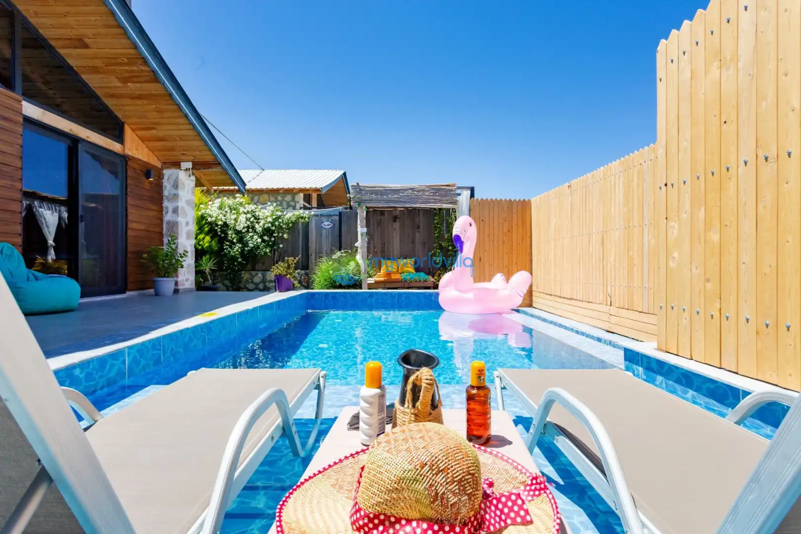 Havuz : Özel bahçe içerisinde ebatları; 8 x 3 metre ve derinliği 1.50 metre olmak üzere özel yüzme havuzu bulunur. Havuz başında tek kişilik ahşap salıncak ve iki adet şezlong yer almaktadır. Havuz ve bahçe bakımı günde 1 kez sabah veya akşam yapılmaktadır.