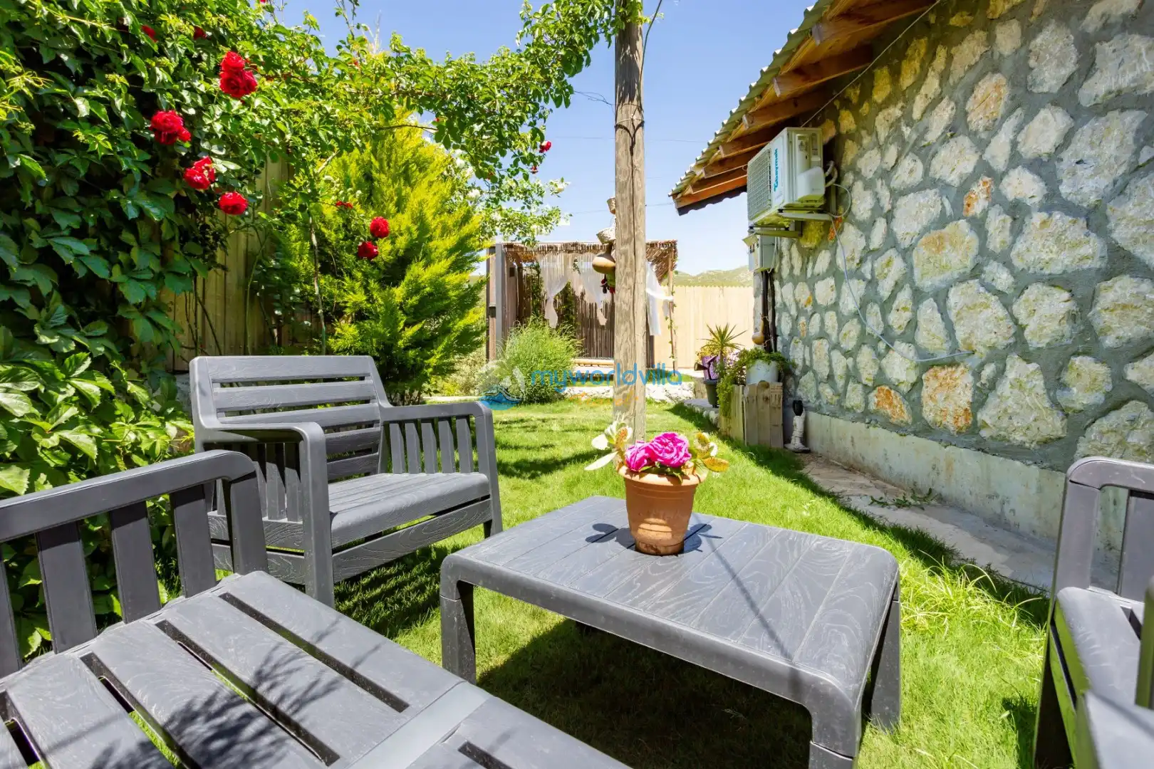 Bahçe : Bahçe bölümünde;  yemek masası, taş barbekü ve kamelya bulunmaktadır.
