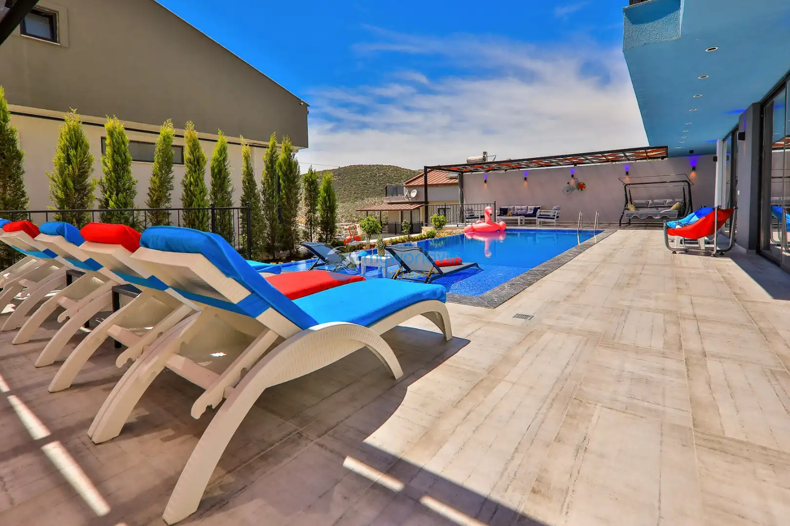 Bahçe : Özel yüzme havuzu, yemek masası, oturma grubu, şezlong, şemsiye, langırt, masa tenisi, mini çocuk oyun parkı, 3 kişilik salıncak ve barbekü bulunmaktadır.