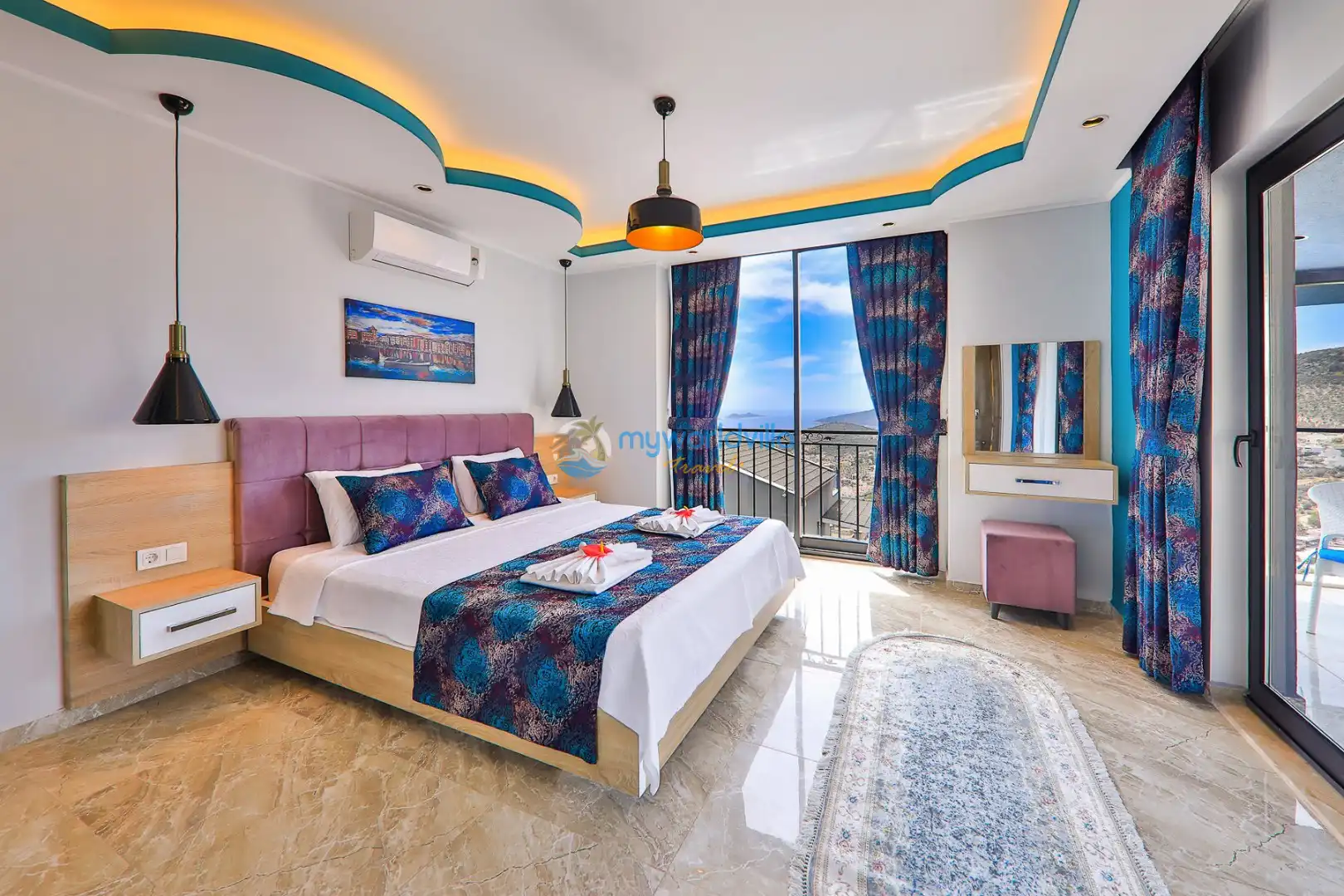 4. Yatak Odası : Çift kişilik yatak, makyaj masası, klima, banyo / WC ve balkon bulunmaktadır. (Balkon içerisinde damla salıncak ve oturma grubu bulunmaktadır.)
